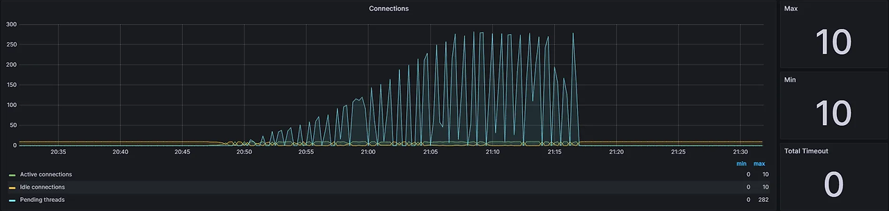 - 지표에서도 알 수 있듯 Connection Pool의 갯수가 너무 적기 때문에 Connection을 얻기 위해 대기 상태에 놓인 Thread가 많은 것을 확인할 수 있었습니다. 이를 해결하기 위해서 Hikari CP의 갯수를 늘리거나 캐시의 도입이 필요해 보입니다.