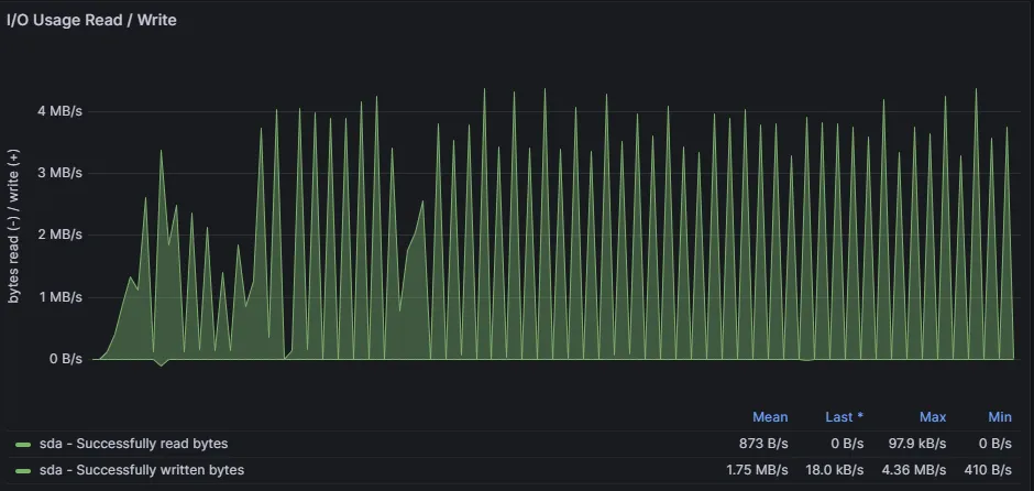 - 다음으론 Disk I/O인데요, 평균적으로 약 1.75MB/s의 속도로 Disk Write가 발생하고 있는 것으로 보입니다. 이는 로그 데이터로 보입니다.
