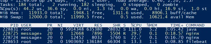 - 다음으론 CPU, Memory, Disk IO에 대한 지표인데요, java와 nginx가 대부분의 CPU를 사용하는 것으로 보입니다.