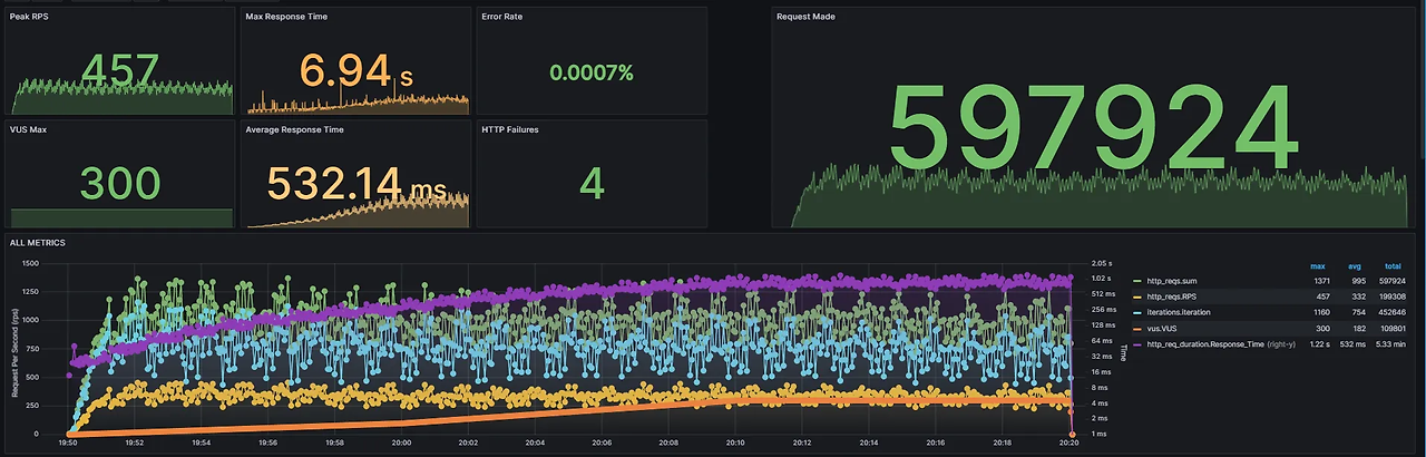 - 먼저 전체적인 지표인데요, 평균적으로 0.5ms 만에 응답을 받을 수 있었으며, 60만개의 요청 중 4개의 요청이 Timeout 되었습니다. 최대 RPS는 약 450 정도 측정되었습니다.
