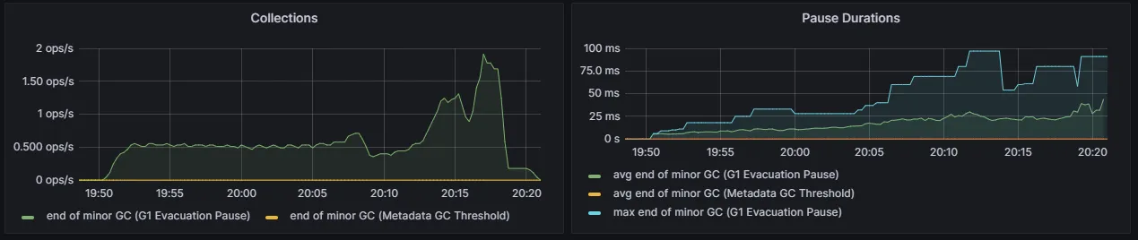 - 다음으로 GC인데요, GC가 많이 일어나긴 했지만 Old GC가 발생하지는 않았고, Minor GC가 몇번 발생한 것으로 보입니다.