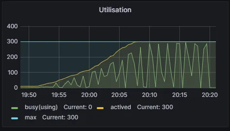 - 그 다음으로 Thread Pool 지표입니다. max Thread Pool을 300으로 설정해놨었는데, 현재 테스트는 최대 동시에 300명의 사용자가 요청을 보내기 때문에 괜찮지만, VUS를 더 늘리면 Thread Pool도 늘려줘야 할 것으로 보입니다.