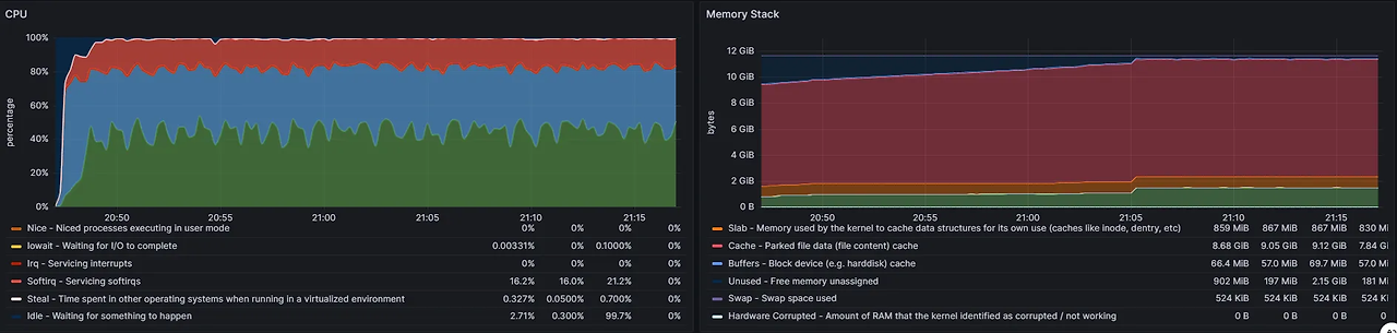 - 두번째 그림에서 CPU는 System(초록색), User(파란색), Soft IRQ(빨간색)이 많이 차지 했는데요, Soft IRQ는 웹 검색을 통해 찾아 보니 네트워크 패킷 송/수신, I/O 처리 등에 사용된다고 합니다.