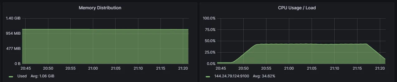 - Spring Actuator로 측정한 CPU와 메모리 정보는 위와 같은데요, System CPU가 100%를 달성하였고, JVM Process는 그중 60%대를 사용하고 있는 것으로 보입니다. JVM Memory는 안정적입니다(오히려 많이 남아서 설정을 통해 줄여야 할것으로 보이네요)