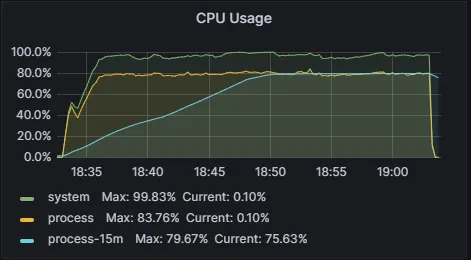 - 그 다음으로 CPU 매트릭과 Thread Pool에 대한 지표인데요, 시스템 CPU 사용량의 대부분이 웹 요청에 사용되는 제가 생각한 이상적인 그림이 나타난다고 보았습니다.