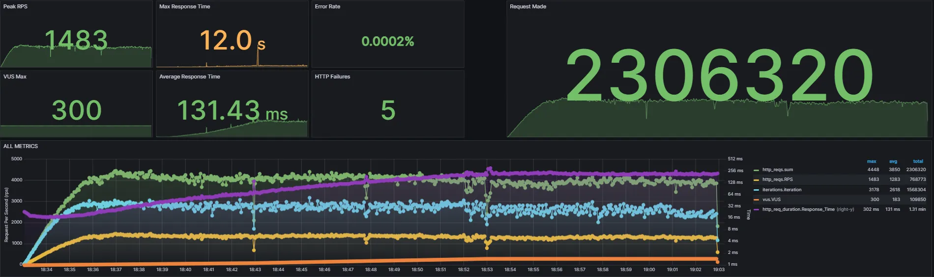 - 먼저 K6 전반적인 지표인데요, 마지막 테스트(842 RPS, p95 970ms)에 비해 최대 RPS는 1483으로, p95 사용자의 응답은 450ms 정도로 RPS는 약 76%, 응답시간은 약 54% 개선이 이루어진 것을 확인할 수 있었습니다.
