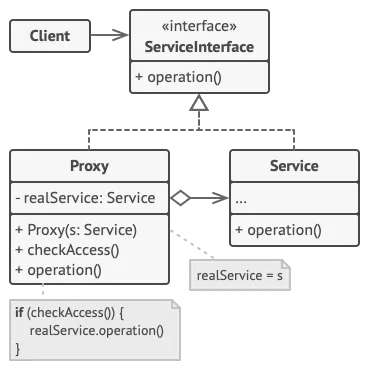 - 구조를 간단하게 설명드리자면, 실제 객체(이하 Service)의 인터페이스를 구현한 Proxy를 만들어, Proxy가 Service를 참조로 가지고 있어 Client가 operation을 호출하면 Proxy의 operation이 실행되고, Proxy가 작업을 수행한 후 Service의 operation을 호출합니다.
